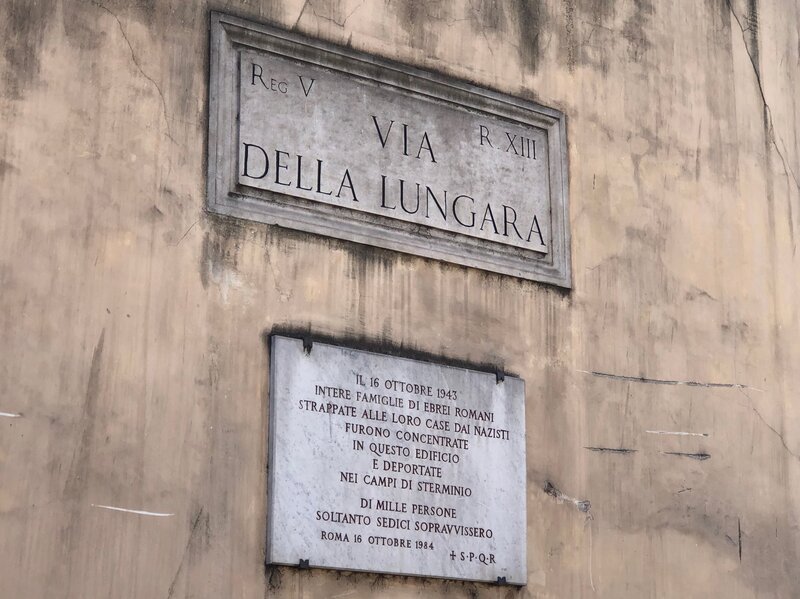 A plaque on the wall outside a military college in Rome recalls the roundup of 1,259 Jews. It reads: "On 16 October 1943 entire Jewish Roman families ripped from their homes by the Nazis were brought here and then deported to extermination camps. Of more than 1,000 persons, only 16 survived."