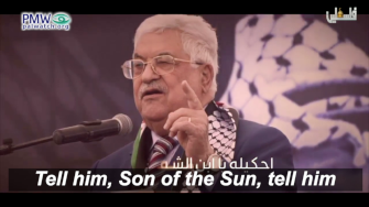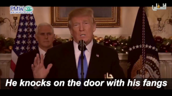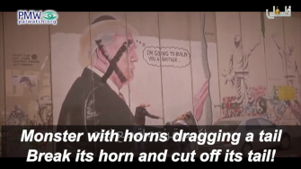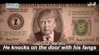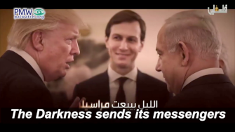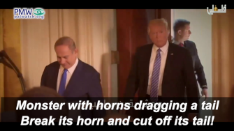 What better opportunity for the PA to rebroadcast a music video demonizing US President Trump, his Senior Advisor Kushner, and Israeli PM Netanyahu than the peace agreements signed with the UAE and Bahrain earlier this month in Washington? In the music video, which Palestinian Media Watch documented was first broadcast by the PA to condemn the Bahrain Conference in 2019, Netanyahu is "Darkness," who uses Trump and Kushner as his "messengers," and "a monster with horns" dragging Trump as his "tail." Standing up to them is PA Chairman Abbas - the "light" - literally "the Son of the Sun":