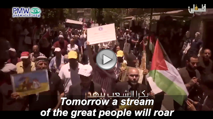 Lyrics: “[Whether you] carry your weapons or not Tomorrow a stream of the great people will roar It will roar towards Palestine and has been singing this revolution for years... The Darkness sends its messengers Tell him, Son of the Sun, tell him Tell him: Leave, O Darkness! Stop trying in every way Monster with horns dragging a tail Break its horn and cut off its tail! The merchant has changed his tune My country's ear no longer heeds him... He knocks on the door with his fangs” [Official PA TV, June 20 and throughout 2019; Jan. 28 (twice), 29, Feb. 11, Sept. 15 (twice), 2020]