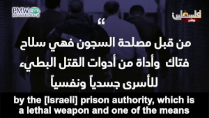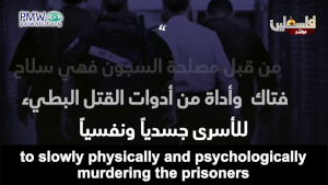 Text on screen: “The prisoners are in danger The prisoners in the occupation’s prisons are being subjected to a policy of deliberate medical neglect (sic) by the [Israeli] prison authority, which is a lethal weapon and one of the means to slowly physically and psychologically murdering the prisoners This policy has led to the death as a Martyr of more than 70 prisoners in the prisons since 1967 The spreading of the Coronavirus inside the prisons The number of those harmed [by the Coronavirus] inside the occupation’s prisons has reached 295 The occupation is deliberately transmitting the virus to the prisoners through its [Israeli] prisoners And it is neglecting their treatment Israeli Minister of Public Security Amir Ohana demanded that the Israeli prison authority not provide Coronavirus vaccines to the Palestinian prisoners (sic., Ohana opposed vaccinating any prisoners – Israeli and Palestinian alike - until the rest of the public was vaccinated first.)” [Official PA TV, March 11, 2021]