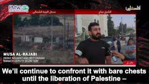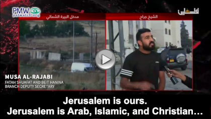 Fatah Shuafat and Beit Hanina Branch Deputy Secretary Musa Al-Rajabi: “We are remaining here. Jerusalem won’t agree to being divided in two. Jerusalem is ours. Jerusalem is Arab, Islamic, and Christian... We’ll protect Sheikh Jarrah as we’re protecting the Al-Aqsa Mosque. We’ll protect the Damascus Gate as we’re protecting the Lions’ Gate. We’ll rise up every day against this tyrannical occupation that is heavily armed ... We’ll continue to confront it with bare chests until the liberation of Palestine – Palestine from the [Mediterranean] Sea to the [Jordan] River, Palestine which is Arab and Islamic. It will remain ours.” [Official PA TV, May 18, 2021]