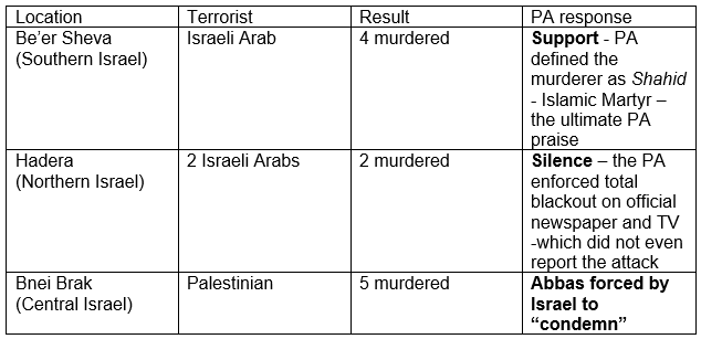 PMW unmasks Abbas’ lame “condemnation”Itamar Marcus | Mar 30, 2022 After the PA’s repeated calls for terror and the PA’s repeated support for terror, Arabs murder 11 people in 3 terror attacks in one week:Sequence of events:February: The PA, including Abbas, repeatedly calls for terror March 1- 21: PA glorifies terrorists who died in terror attacks March 22: Terrorist murders 4 in Be’er Sheva, PA openly praises him as “Martyr” March 27: Terrorist murders 2 in Hadera, PA is silent March 29: Terrorist murders 5 in Bnei Brak, Abbas forced to issue lame condemnationAfter 2 months of intensified PA promoting terror and support for terror attacks, 3 terror attacks by Arabs in one week leave 11 people in Israel murdered. PA Chairman Abbas was the leader of the calls to Palestinians to murder Israelis. For example, at the PLO Central Council meeting in February: “President [Abbas called] in all his speeches to initiate popular resistance.” [Official PA TV, Feb. 8, 2022] PMW has documented that “popular resistance” is the PA call for civilians to carry out terror attacks. Having promoted terror for 2 months, the PA glorified the first terror attack in which 4 Israelis were murdered. After criticism from Israel, the PA was silent about the second attack in which 2 were murdered. And then only when Israel's defense minister and the United States pressured Abbas he issued a lame condemnation. PA responses to Arab terror murdering 11 in one week