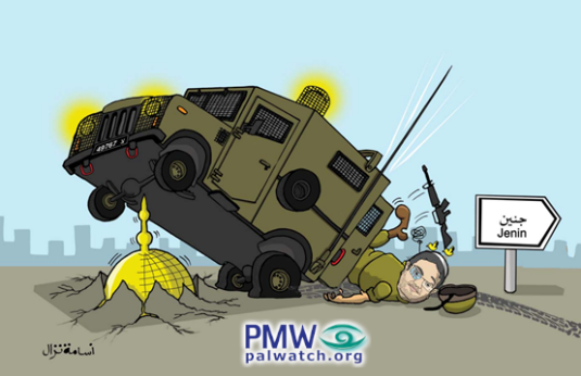 [Official PA daily Al-Hayat Al-Jadida, Jan. 29, 2023] The cartoon shows Israeli Minister of National Security Itamar Ben Gvir depicted as a soldier falling out of an Israeli military vehicle, which is driving away from Jenin as indicated by a sign marked “Jenin” pointing in the opposite direction. Ben Gvir is falling out of the vehicle because the spike of the Dome of the Rock, representing Jerusalem, is protruding from the ground and lifting the vehicle in the air. The Dome of the Rock possibly symbolizes terrorist Khairy Alqam who murdered 7 and wounded 5 outside of a synagogue in Jerusalem the following day, and terrorist Muhammad Aliwat who wounded 2 in Jerusalem the day after. Jenin gun battle, January 2023 - Palestinian terrorists opened fire on Israeli soldiers while they were conducting a counter-terror operation in Jenin on Jan. 26, 2023. In the ensuing gun battle 8 terrorists, including PA police officer and Al-Aqsa Martyrs' Brigades (Fatah's military wing) member Izz Al-Din Salahat, were killed, as was 1 Palestinian civilian. The soldiers were in Jenin to arrest a senior Islamic Jihad terrorist and prevent an imminent terror attack. The following are longer excerpts of the reports cited above: Headline: “Washington hurried to condemn despite its silence over the massacre of Jenin and its refugee camp! Seven settlers were killed in an operation in the Neve Yaakov settlement and Khairy Alqam who carried it out died as a Martyr” “At least seven settlers were killed in a shooting that took place yesterday evening, Friday [Jan. 27, 2023], outside of a synagogue in a settlement neighborhood in occupied East Jerusalem, which was carried out by an armed man [Khairy Alqam] (i.e., terrorist, murdered 7) who died as a Martyr, according to the occupation police. The operation (i.e., terror attack) came a day after the massacre committed by the occupation forces in Jenin and its refugee camp, which led to the deaths as Martyrs of 9 civilians (sic., refers to Palestinian terrorists shooting at Israeli soldiers during a counter-terror operation, see note below).” [Official PA daily Al-Hayat Al-Jadida, Jan. 28, 2023]