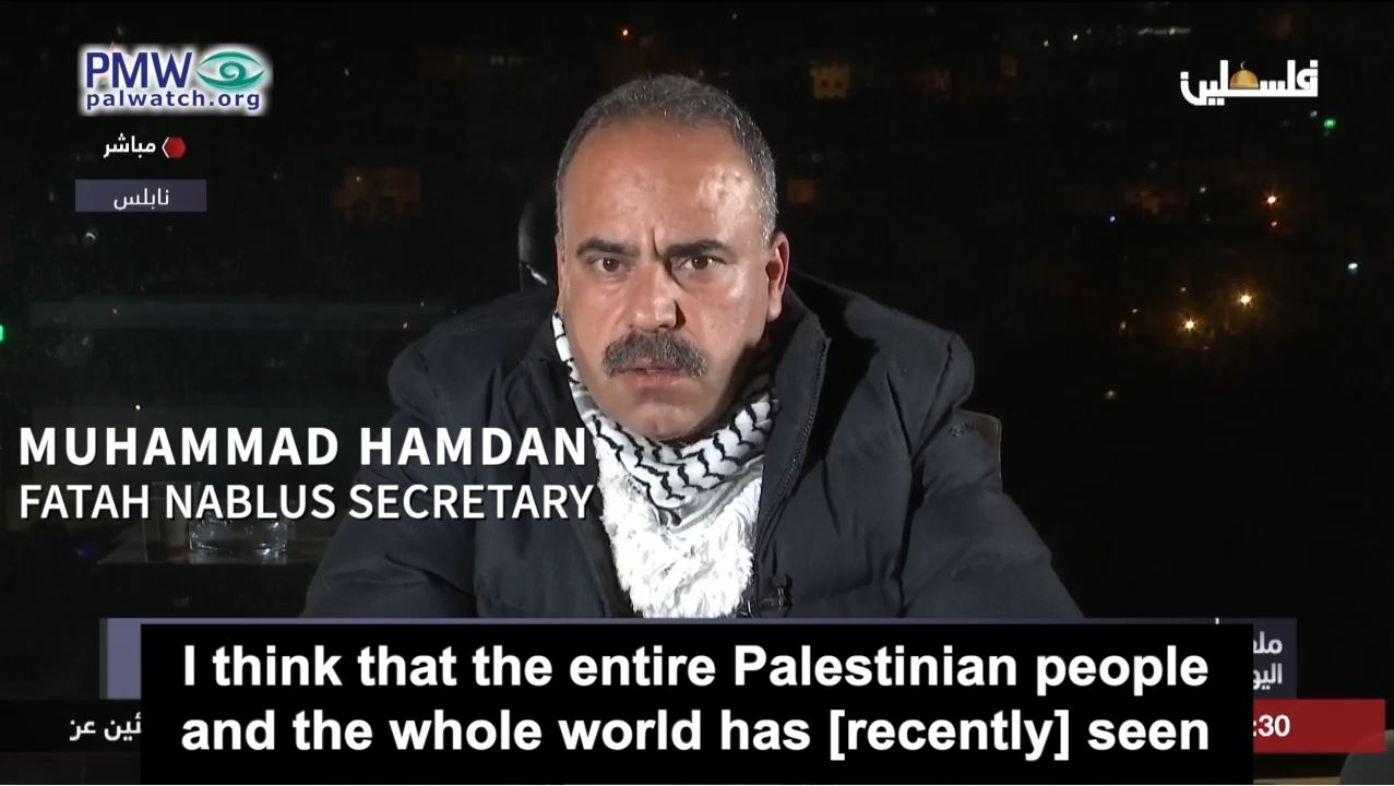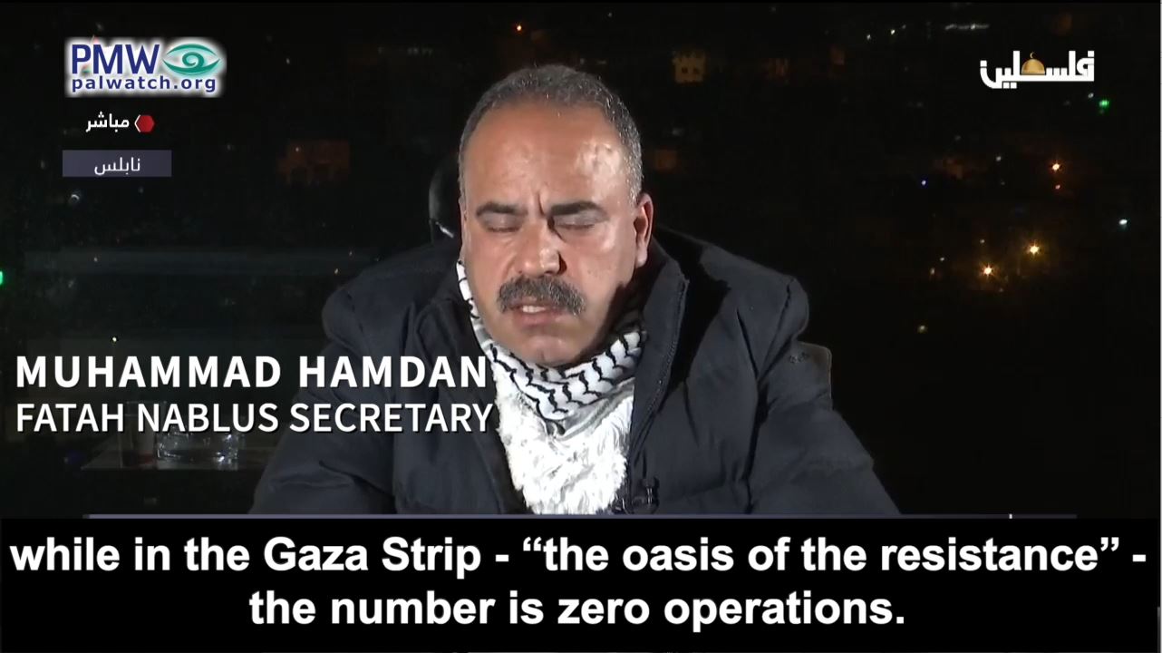 Fatah Nablus Secretary Muhammad Hamdan: “Hamas is accusing the West Bank of security coordination [with Israel]. I think that the entire Palestinian people and the whole world has [recently] seen that more than 1,500 military operations (i.e., terror attacks) against the Israeli occupation were led by the Fatah Movement members and the [PA] Security Forces members, while in the Gaza Strip - ‘the oasis of the resistance’ - the number is zero operations.”