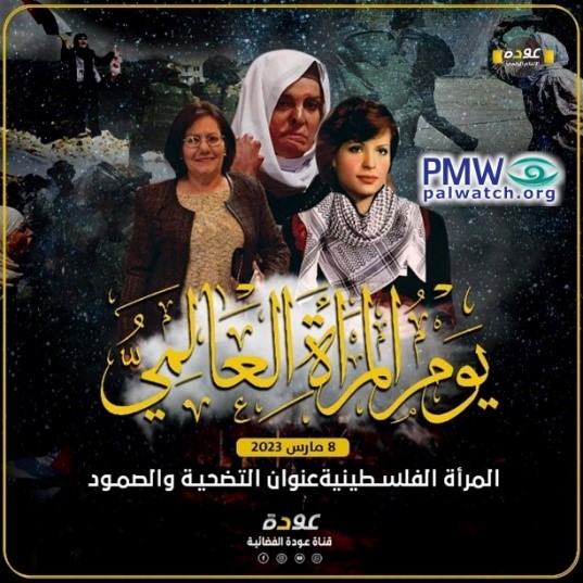 The image shows from left to right terrorists Theresa Halsa, who was involved in the killing of 1; Israa Ja’abis, who wounded 1; and Dalal Mughrabi, who led the murder of 37, 12 of them children. In the upper right is the logo of Fatah-run Awdah TV. Text on image: “International Women’s Day March 8, 2023 The Palestinian woman is a symbol of sacrifice and resolve” [Fatah Commission of Information and Culture, Facebook page, March 7, 2023]