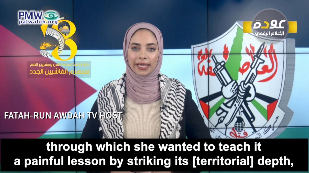 In the upper right corner of the video is the logo of Fatah-run Awdah TV. Fatah-run Awdah TV host: “‘My last will to you all, my rifle-bearing brothers, begins with freezing the secondary conflicts and escalating the main conflict against the Zionist enemy and aiming the rifles, all the rifles, at the Zionist enemy. What protects the independence of the Palestinian decision is the firm rifles of all the Palestinians. I say to all my brothers wherever they are to continue on the same path we went on.’ This is the last will of Dalal Mughrabi (i.e., terrorist who led murder of 37, 12 of them children), or ‘the Bride of Jaffa’ as the Palestinians call her, who was full of love for the homeland and dedicated her life to see it free and proud. Dalal carried out an operation (i.e., terror attack) against the occupation, through which she wanted to teach it a painful lesson by striking its [territorial] depth, and thus she wrote with her blood a new page in the history of the Palestinian resistance in 1978. Dalal Mughrabi died as a Martyr after waving the Palestinian flag and saluting it. Her image still angers the occupation. [Israeli] occupation Prime Minister [Benjamin] Netanyahu ordered in March 2016 to submit a complaint against the PA because it celebrates the anniversary of her death as a Martyr. What is more, the occupation refused to hand over her body.” [Fatah Commission of Information and Culture, Facebook page, March 11, 2023]