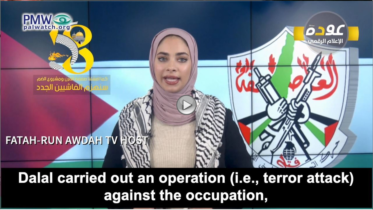 In the upper right corner of the video is the logo of Fatah-run Awdah TV. Fatah-run Awdah TV host: “‘My last will to you all, my rifle-bearing brothers, begins with freezing the secondary conflicts and escalating the main conflict against the Zionist enemy and aiming the rifles, all the rifles, at the Zionist enemy. What protects the independence of the Palestinian decision is the firm rifles of all the Palestinians. I say to all my brothers wherever they are to continue on the same path we went on.’ This is the last will of Dalal Mughrabi (i.e., terrorist who led murder of 37, 12 of them children), or ‘the Bride of Jaffa’ as the Palestinians call her, who was full of love for the homeland and dedicated her life to see it free and proud. Dalal carried out an operation (i.e., terror attack) against the occupation, through which she wanted to teach it a painful lesson by striking its [territorial] depth, and thus she wrote with her blood a new page in the history of the Palestinian resistance in 1978.” [Fatah Commission of Information and Culture, Facebook page, March 11, 2023]