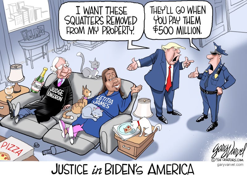 Gary Varvel: Squatters, property-rights and election interferenceA couple of Varvelous interviews plus what you're paying for in the $1.2 trillion spending billEven if you’re a Never Trumper, you have to admit that being fined nearly a half a billion dollars is excessive and an obvious weaponization of the government. In this cartoon I combined the recent issue of “Sqatters rights” with what Judge Engoron and D.A. Letitia James are threatening to do with Trump’s properties if he doesn’t cough up $500 million. (For comic relief, I drew some cats). THE HEART OF AMERICA’S PROBLEMI originally wrote and posted this in 2021.“For out of the heart proceed evil thoughts, murders, adulteries, fornications, thefts, false witness, blasphemies.” - Matthew 15:19 Imagine that you came home from a trip and found that you left the water running upstairs and it had overflowed and was pouring from the ceiling, running down the stairs and pooling on you nice hardwood floors. Now, what would you do first? You would go to the heart of the problem, right? You’d shut off the water first. There is a flood of violence in America today but instead of addressing the heart of the problem, politicians focus on pass laws. President Biden announced some executive actions that he says will stop gun violence. News flash: Law-breakers, break laws, that’s why they’re called law-breakers. Passing more laws or executive orders won’t stop them. Why? Because it doesn’t get to heart of the problem which is the problem with the heart of mankind. Jesus said that evil thoughts and murders proceed from the heart. The only way to create a moral society is to train them from the only source of morality: The Bible. Unfortunately, we are reaping what we sowed when we stopped teaching the Bible in schools in 1963. The case was Abington v. Schempp and the U.S. Supreme Court decided that school sponsored Bible reading in public schools in the United States to be unconstitutional. The court disregarded the fact that the Bible had been taught in American schools since Massachusetts passed the Old Deluder Satan Act in 1647. The religious intent of the law was to stop, “ye old deluder, Satan” in his goal “to keep men from the knowledge of ye Scriptures.” In other words, the Puritans started schools to teach people to read so that they could read the Bible. The New England Primer textbook used Bible verses to teach the alphabet. This was the educational system of our Founding Fathers. But since 1963, we have created a famine in America, not of food or water, but of the Word of God (Amos 8:11). Oh sure, the Bible is easily available online or through an app but for 60 years Americans weren’t exposed to the Bible in school and the majority don’t read it today. As a result they don’t know basic truth like; God created 2 genders (male and female). Watch this clip of Mr. Rogers on the Tonight Show in 1980, as he talks about genders at about the 6:50 mark. Listen to the audience reaction. This was when people still had common sense to know right from wrong. Forty-four years later we have a society that is Biblically illiterate. And this is why our politicians aren’t able to diagnose the heart of our problems like gun violence or what bathroom to use. I hate to say it but the Old Deluder, Satan has succeeded. Where is the hope for America? Romans 1:16 says, “I am not ashamed of the gospel because it is the power of God for the salvation of everyone who believes. First for the Jew and then for the Gentile.” As we get closer to the celebration of Resurrection Day (Easter), I pray that American’s will turn their hearts back to our only hope. INTERVIEWThe Substack channel: How to Subvert Subversion with Yuri Bezmenov interviewed me for his podcast. We covered my career, AI-generated cartoons and what has happened to America. FYI: Yuri is a young man who admires the late Soviet defector, Yuri Bezmenov and is carrying on his mission to educate us in the west to the ideological subversion tactics of Marxists. You can follow his channel here. VIDEO INTERVIEW with my son, Brett Varvel: CBN News’ Billy Hallowell interviewed Brett (star of Running the Bases, Mayberry Man, Play the Flute) at the National Religious Broadcasters convention (NRB). Brett discussed his role as Andy in the TV show COUNTY RESCUE on the Great American Family Channel. The final episode appears Monday night at 8pm ET. RIGHT VIEWSVIDEO - In House floor remarks, Rep. Chip Roy (R-TX) warned Republican lawmakers not to vote for the government funding bill with a price tag of $1.2 trillion and filled with pork. For example: