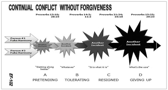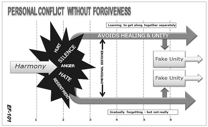 It is an honor to have you as a member of our subscription service! Share today. MY LIFE: #51 Me Forgive You?Dr. Stephen Phinney: Forgiveness is functioning with another, as if they never committed the offense in the first place.THE TRAP OF HOLDING OFFENSESSo, as those who have been chosen of God, holy and beloved, put on a heart of compassion, kindness, humility, gentleness, and patience; bearing with one another, and forgiving each other, whoever has a complaint against anyone; just as the Lord forgave you, so also should you. (Colossians 3:12-13) God requires believers to forgive as they have been forgiven. We must forgive anyone who has hurt us and against whom we hold anything. Extending forgiveness before God can free us from anger and pain in prayer.This cannot happen unless the Lord has reduced us to a heart of compassion, kindness, humility, gentleness, and patience, which takes brokenness. Brokenness is probably one of my least favored words because it requires pain and suffering. To embrace the truth that we learn obedience through the things we suffer requires a mindset that can only be found in Christ. It requires a mindset that is critical that we allow the power of forgiveness to manifest through our suffering. Our goal should be to identify any individuals who have hurt us so that we can fulfill this mandate. When we have been hurt by someone (intentionally or unintentionally) and continue to be bothered by it – it is time to extend forgiveness in prayer, even if that person is deceased. One of the most common manifestations of someone NOT extending forgiveness at the moment of being hurt is the nasty habit of grudge-carrying. Anger is another classic symptom of not forgiving. An indwelt believer’s growth in Christ is immediately affected when un-forgiveness clouds the heart. Allow me to explain the process of achieving oneness with another person – saved or not. I was raised to avoid openness at all costs. My parents ingrained in me the idea that exposure leads to betrayal.That might be true, but their objective was to teach their children to avoid conflict. The problem with this irony is that it separated me from relationships that could have benefited my growth. Another misnomer I was taught was never trust humans! Your dog, maybe, but humans, absolutely not. This poor teaching added to my already detached soul. Throughout my childhood and young adult years I developed a nasty habit of refusing to admit I was wrong, refusing to repent to God or man, and avoid reconciliation due to it reopens the door for more betrayal. As you might guess, it all resulted in experiencing zero oneness with others and God. So…my attractions remained fleshly - whatever made me feel “good.” The above illustration reveals the process of achieving oneness in a relationship. This process fits any voluntary relationship, for example, marriage, business partners, or friends. Relationships begin with an attraction of some type, leading to openness—the “C” placed right after EXPOSURE stands for commitment or a test thereof. When EXPOSURE comes, we tend to see things in ourselves and the other person we don’t like…and sometimes hate. Exposure brings conflict, which – if not dealt with through Christ, will bring about CONFLICT. If conflict is not resolved, according to the ways of Christ, SEPARATION will develop in both parties. Separation starts in the spiritual area of life and regressively goes down the list one at a time - until, in many instances, legal problems. The only way to bridge the gap between the two, removing the sin of separation, is to bring about reconciliation. This won’t happen until one or both individuals repent. Sadly, most people cannot be moved to repentance until the separation has broken them into a pile of humility. Reconciliation has three parts: extending forgiveness, seeking forgiveness, and rebuilding the relationship. Mature love happens once repentance and authentic reconciliation has its perfect way. God desires oneness in all relationships, even if only one member is willing to go through these steps. Personal conflict without forgiveness leads to “living death”—a constant dread that something is wrong in the believer’s life. The diagram above (EF-101) illustrates the effects of unresolved conflicts. What do most people do with conflict? Nothing! When a conflict happens, an emotional explosion frequently erupts. It is through this explosion that hurt, silence, anger, hate, resentment, and a multitude of other fleshly reactions separate the two in conflict. The dash lines represent time passing – hours, days, weeks, months, or years. When you are hurt, you don’t want to forgive immediately – few do. Gradually, the intensity of the emotions subsides; but without forgiveness, oneness no longer exits. Choosing NOT to forgive someone who has hurt you will eat at you like a slow growing cancer. One of the most common deceptions is “time heals all things.” Boy, what a lie that is! Time heals nothing; in fact, it makes things worst. What time and distance does do is put both parties into a position of faking it until they make it, which normally never happens. Since time does not heal, what does? Forgiveness in Christ by releasing Him from within! The illustration below is to show the effect of unresolved conflict when time is allowed to pass without forgiveness. Without forgiveness, conflicts tend to escalate (at least in the mind of the individual who is getting hurt). Notice that the conflicts and the emotional distance are getting larger, because the two people aren’t coming back together through forgiveness. Pride is a major barrier to the forgiveness process. When you review the verses in Proverbs, you will notice how each refers to PRIDE. Another barrier in extending forgiveness is a desire to protect ourselves. Trusting in self-protection is a form of control, which is playing-god - thus, we are not trusting God and wi