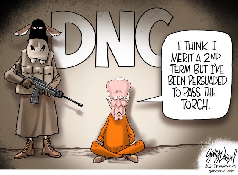 In my opinion, President Biden looked like a hostage being forced to read a speech against his will on Wednesday night when he addressed the nation about leaving the presidential race. Read the Victor Davis Hanson’s piece about the recent history of the DNC’s shenanigans. You’ll discover that this is the third coup that they have perpetrated on their political candidates. We should call DNC, the Dictator National Committee. Their party leaders usurped the will of 15 million Primary voters who voted for Biden by forcing the cognitively challenged commander in chief to quit the race. And now they are dictating to democrat voters that they must support Vice President Kamala Harris. Democrats should be mocked whenever they mention election interference and disenfranchising voters. They could teach a master class on how its done. When the righteous increase, the people rejoice, but when the wicked rule, the people groan. - Proverbs 29:2 RIGHT LINKSVictor Davis Hanson: We have now witnessed three left-wing veritable coups. Townhall - Josh Hammer: The bloodless coup of Joe Biden will not work out well for Democrats. VIDEO - Sky News Australia: Life imitates art — The Veep TV show and Kamala Harris mash up. WND - Bob Unruh: Watch Kamala Harris get savaged by MSNBC women-voter focus group. Babylon Bee parody: The party cheating in the primary election solemnly promised that it would definitely not be cheating in the general election. Be sure to click the heart to like this post. It helps me reach more people.NEED A SPEAKER FOR YOUR GROUP?Contact me for a unique experience of visual and verbal humor. Email: gary@garyvarvel.com...  Unlock this post for free, courtesy of Gary Varvel.A subscription gets you: