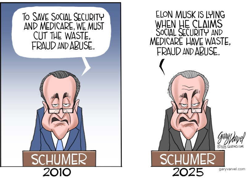 Gary Varvel: Flashback: Dems wanted to cut waste, fraud and abuseDems threaten shutdown bluff, Paid Subscribers: Time lapse videos and Humor Me winnersHypocrisy much? In 2010, President Obama held a meeting with Congressional leaders and it was recorded. There is video of Sen. Chuck Schumer and Nancy Pelosi saying that they needed to cut waste, fraud and abuse from Social Security and Medicare. Katie Pavlich curated the videos. Check here. Fast-forward 15 years with President Trump’s DOGE doing the very thing and Schumer proposed and now he and the Dems are losing their minds. They say Elon Musk is lying about the waste, fraud and abuse. What changed? It’s all about political power and the Dems are losing it. Help me reach new subscribers by clicking the like button.Political suicide: Fox News reports: Republicans are ramping up pressure on Senate Democrats ahead of a vote on the House-passed stopgap spending bill to keep the government open, even dubbing a potential funding lapse as a "Schumer shutdown." My how the tables have turned. Republicans usually get blamed for shutdowns, but the Democrats are proudly proclaiming that they will vote against any continuing resolution. But last night, “Chuck Schumer caved on shutting down the government, and House Democrats are super angry.” Here’s a Townhall column by Rebecca Downs. And Matt Vespa writes, “The Dems just can't beat Trump...and it's glorious to watch.” Schumer called Republicans “bastards” and said, “They’re ruining democracy.” Chucky, our government is a Constitutional Republic. DEVOTIONAL“Instead, let the Spirit renew your thoughts and attitudes. Put on your new nature, created to be like God—truly righteous and holy.” - Ephesians 4:23-24 What is the purpose of your life? It’s March Madness once again. Can you imagine watching a basketball game in which the backboards had no basketball goals? There would be no point in playing. Sadly, that’s the way millions of people live their life. Shortly before his death, Mark Twain wrote these words. "A myriad of men are born; they labor and sweat and struggle...they squabble and scold and fight; they scramble for little mean advantages over each other; age creeps upon them; infirmities follow...those they love are taken from them and the joy of life is turned to aching grief. It (the release) comes at last – the only unpoisoned gift earth ever had for them – and they vanish from a world where they were of no consequence...a world which will lament them a day and forget them forever." Yikes! That, my friends, is a life without purpose. The Bible says, God created humans in His image to have fellowship with Him. But when Adam and Eve sinned, that image was marred by sin and death which separated us from God. For this reason, Jesus came to restore our fellowship with God.