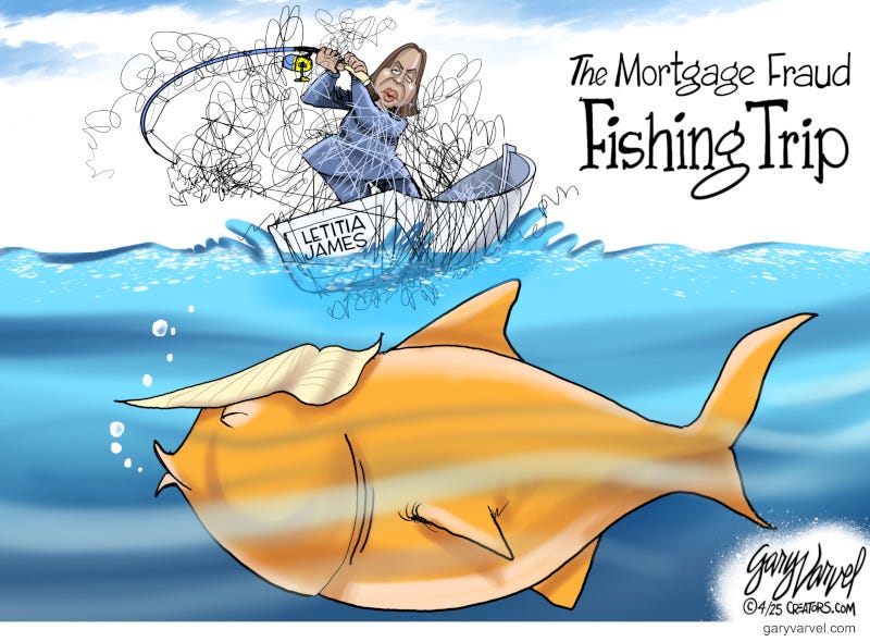 Townhall’s Kevin McCullough writes: These judges didn’t make mistakes. They chose evil. And a nation that tolerates that choice won’t survive for long. VIDEO - U.S. Attorney General Pam Bondi talks about the details that led to the arrest of these two judges. Help me reach new subscribers by clicking the like button.New York Attorney General Letitia “No one is above the law” James, who campaigned on promising to get Trump, then after being elected, prosecuted and convicted Donald Trump for exaggerating his wealth, appears to be tangled up in legal mess of her own. The New York Post reports, America First Legal (AFL) a Trump administration-aligned legal watchdog group is demanding a state probe into bombshell accusations of mortgage fraud recently leveled against James. AFL has filed a complaint against James with the New York State Unified Court System’s Committee on Professional Standards. James claimed her primary residence was in Norfolk, Virginia, on a 2023 mortgage application despite her position requiring New York residency. She calls this Trump’s retribution tour. She would know. RIGHT VIEWSHarbinger’s Daily - Tom Gilbreath: The Bible talks about a future war where Russia and Iran lead a coalition of nations in an all-out assault on Israel. At a time when Trump is threatening Iran to end their nuclear weapons program, Russia’s lawmakers just ratified a sweeping 20-year strategic partnership agreement with Iran and Putin signed it into law. Are we seeing the alignment of nations listed in the Ezekiel 38-39 prophecy? American Greatness - Victor Davis Hanson: Trump’s trade strategy aims to slash the U.S. deficit by forcing fairer deals with key partners—pushing reciprocity, not profiteering, to regain economic balance. HUMOR MEHUMOR ME: Fix my cartoon with a snarky remark. Email your entries to gary@garyvarvel.com. Winners announced in Friday’s newsletter for paid subscribers. Continue reading this post for free in the Substack app |