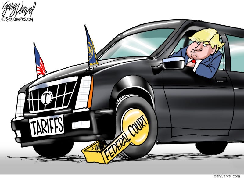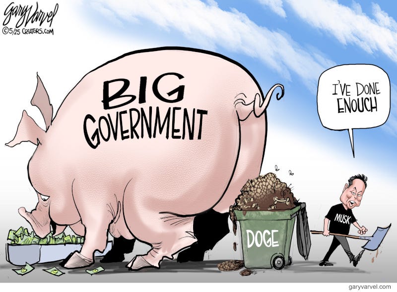 Now the judiciary is telling President Trump that he has no authority to enact reciprocal tariffs on foreign nations. The Court of International Trade ruled against Trump’s administration on Wednesday which inspired this cartoon. On Thursday, a federal appeals court ruled that the tariffs could be reinstated as the case is appealed. Townhall’s Matt Vespa wrote about this issue. Help me reach new subscribers by clicking the like button.Elon Musk is leaving DOGE to go back to his businesses and he looks like a man who has had enough. He fought the swamp and the swamp won. So far, Congress has not implemented any of the cuts in waste, fraud and abuse the DOGE uncovered. Instead, it looks like it’s ready to spend trillions more than it takes in. RIGHT VIEWSVIDEO - Victor Davis Hanson unpacks South Africa’s racialist policies and its attempt to leverage U.S. generosity while showing open hostility. Townhall - Jay Sekulou: Taxpayers give Planned Parenthood 39% of its revenue: It’s time to permanently defund the abortion giant. Townhall - Rebecca Downs: Ilhan Omar sure is mad as Planned Parenthood facing closures with 'Big, Beautiful Bill.’ NEED A SPEAKER FOR YOUR GROUP?Contact me at: gary@garyvarvel.com Continue reading this post for free in the Substack app |