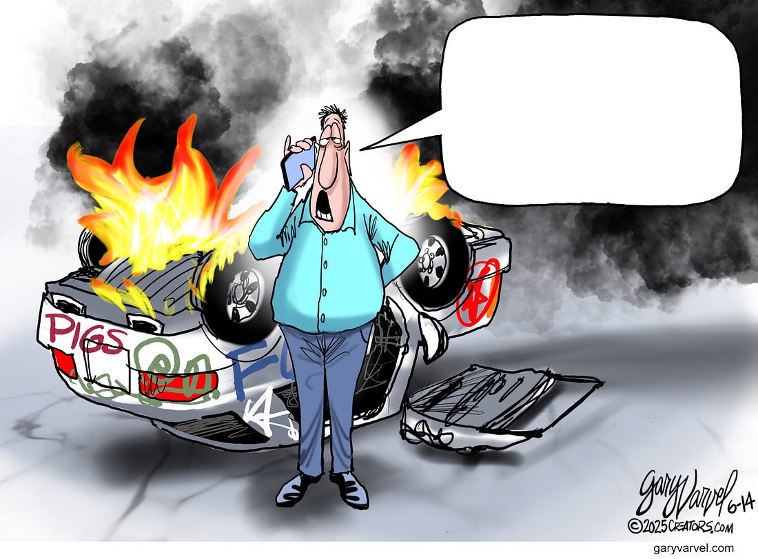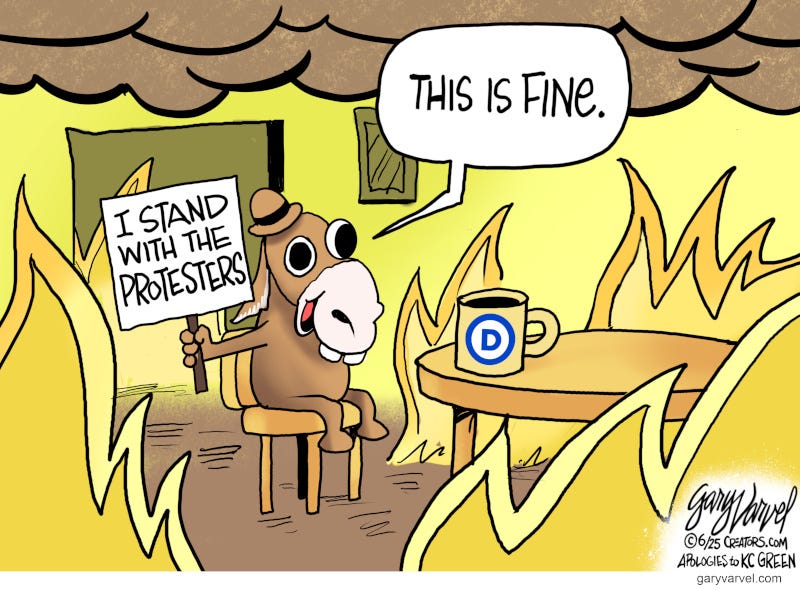 Gary Varvel: Dems say, don't believe your own eyesPaid subscribers get a bonus cartoon from my archivesHat tip to KC Green who created the cartoon of a dog sitting a room, surrounded by fire saying “This is fine.” This classic illustration reflects what the Democrats are doing when they say “stand with the protesters” who are violently destroying property. Obviously, it’s NOT fine. The Democrats are fine with… Despite video footage showing rioters hurling rocks, Molotov cocktails, torching cars while burning American flags, Rep. Maxine Waters, the Democrat Congresswoman from California said, “There was no violence. I was on the street, I know.” In the words of Speaker Mike Johnson, “Bless her heart.” I must have been absent from school the day they taught “How to Make Your Point by Lighting Stuff on Fire.” Please, Maxine, tell me more about how breaking windows, looting stores and assaulting people is the pinnacle of moral high ground.