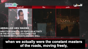 Referring to meetings within the PLO and Fatah, Director-General of Popular Activity in the PA-controlled Committee to Resist Settlements and the Wall Abdallah Abu Rahma explained that the “main topic” there, and for Abbas too, is “popular resistance.” Abu Rahma clarified what they mean by the term - violence intifada style: