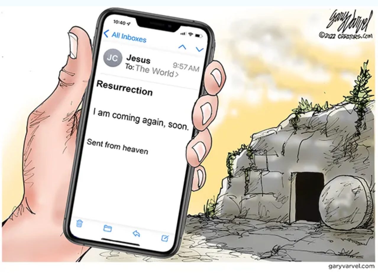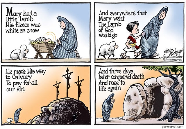 Jesus came the first time as the Savior to die for our sins, not to affirm of our sins. Jesus endured the wrath of God for us on the cross. Then He rose from the dead on the 3rd day and offers us eternal life if we repent and trust in Him. If you’ve never repented of your sins and asked Jesus to save you, I encourage you to do it today before Jesus comes again. ARCHIVE 2022: A modern reminder that Jesus promised to return. Could we be the generation that sees it happen? Be sure to click the like button. It helps me reach more people.RIGHT VIEWSTownhall - Michael Brown: America is in moral freefall. Townhall - Magdalene Horzempa: Bad Eggs: The Biden administration’s politicization of Easter. American Greatness - Debra Heine: Joe Biden denies honoring ‘Transgender Day of Visibility’ on Easter: ‘I didn’t do that.’ Be sure to click the like button. It helps me reach more people.HUMOR MEHUMOR ME: Fix my cartoon with a snarky remark. Email your entries to gary@garyvarvel.com. Winners announced in Friday’s newsletter for paid subscribers. My Israel essay series:Part 2: God’s promise to Israel Part 4: God’s restoration of Israel to Himself My essay series on America’s spiritual war:Part 1 - The War Within America Part 2 - The War Within America - Baal Part 3 - The War Within America - Ishtar Part 4 - The War Within America - Molech Part 5 - The War Within America - Fundamental change My Series of Essays on God’s TimelinePart 1 — God’s 7000-year timeline: Mount Sinai, Transfiguration, Jericho and Sabbath Prophecies Part 3 — God’s 7000-year timeline: Hosea and Woman at the Well Prophecy Part 4 — God’s 7000-year timeline: The Lazarus Prophecy Part 5 — God’s 7000-year timeline: The Job Prophecy Part 6 — God’s 7000-year timeline: The Jubilee Prophecy Part 7 — God’s 7000-year timeline: The Good Samaritan Prophecy Part 8 — God’s 7000-year timeline: The Creation Prophecy Part 9 — God’s 7000-year timeline: The Wedding in Cana Prophecy Part 10 — God’s 7000-year timeline: The Esther Prophecy Support my work by visiting my online store at garyvarvel.com/storeYou're currently a free subscriber to Views From The Right. For the full experience, upgrade your subscription.  |